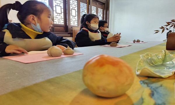 课堂上,泥塑老师细心地给同学们分发垫板、围裙和泥巴,一切准备就绪,有趣的泥塑课就开始了。简单有效的“搓、捏、顶、压”四步,让同学们轻松动手做出一个个形象生动的桃子泥塑。孩子们兴趣浓厚,分享展示了自己的泥塑桃子,接着兴致勃勃地发挥想象力,自由创作泥塑。课程最后,老师还贴心把每个作品编号烧制,待时间酝酿出独一无二的特别工艺品进行展示。