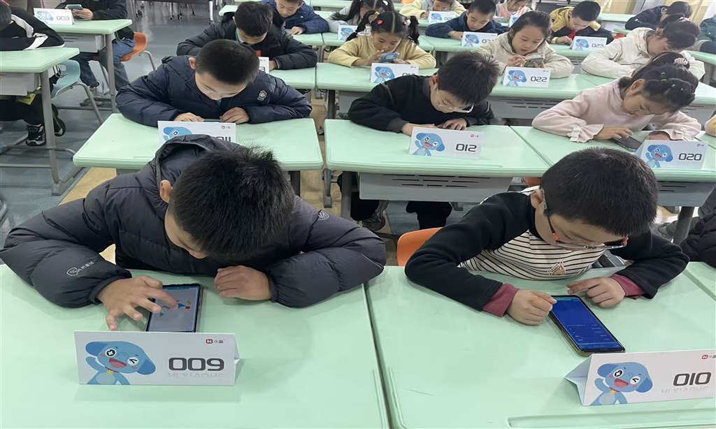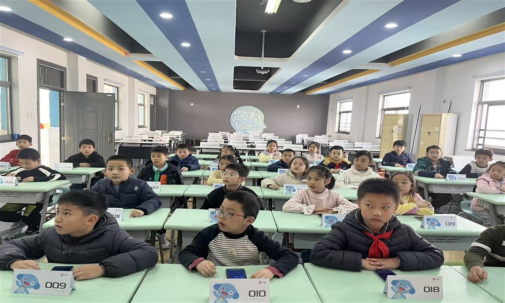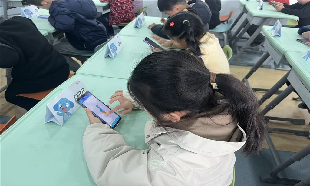 活动教室的浅绿色课桌上,每个孩子面前都摆着带编号的互动立牌与手机设备。屏幕亮起的瞬间,原本热闹的教室立刻安静下来:孩子们有的俯身向前,指尖精准拖动屏幕里的彩色板块,先锁定图形的边缘轮廓,再用小三角形补全角落,整套操作一气呵成;有的眉头微蹙,短暂停顿后立刻找到分割思路,手指在屏幕上的移动速度明显加快。同学们各自盯着设备屏幕,只有指尖触碰屏幕的轻响在教室流转——这场“完成7个指定图形七巧板分割”的竞速赛,比的是对图形关系的理解,更是思维反应的速度。