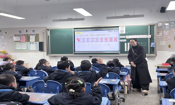 低年级数学教学如何让数学学习更有趣味?王雪薇老师以游戏化教学为切入点,给出了生动答案。在《好玩的抢10》课堂上,王老师充分结合一年级学生的认知特点和天性,以“数学游戏”为核心载体,先通过趣味提问激活学生已有游戏经验,强调“按规则游戏”的重要性,再借助扑克牌教具,引导学生先开展“选牌凑十”的准备活动,为后续游戏环节做好铺垫。课堂中,王老师以图文结合的方式清晰示范游戏规则,组织学生两人一组开展分层游戏:从“两个数相加等于10”的基础玩法,到“几个数相加等于10”的进阶挑战,学生们在紧张有趣的抢牌、算牌过程中,不仅熟练掌握了10以内加法的“凑十”方法,更在自主探究中积累了分析问题的经验,培养了思维的条理性与灵活性。游戏间隙,王老师注重巡视指导,及时关注学生的个体差异,课堂氛围活跃有序,真正实现了“在玩中学、在乐中悟”的教学目标。