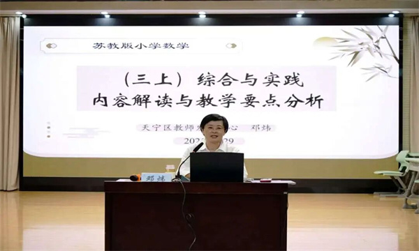 课例展示后,天宁区教师发展中心邓炜老师带来《(三上)综合与实践内容解读与教学要点分析》主题报告,从教材编排逻辑、学生认知规律、教学实施策略三个维度进行了深度剖析。邓老师强调综合实践教学需改变学习方式,倡导合作探索与交流;同时指出课前课尾要与前后内容建立联系,形成知识的连续生长。随后,她针对三年级“常见的量”相关综合实践内容,分别解读了《一天的时间的表示》《经过多长时间》《合理安排一天的时间》等课例的教学关键点,为教师们深入理解新教材、优化课堂教学提供了专业引领。