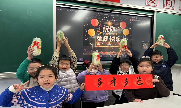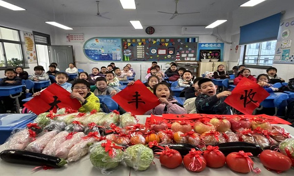活动现场,二(2)班的教室变身热闹非凡的丰收兑换站,成为校园里一道亮眼的风景线。新鲜的包菜、饱满的茄子、红润的西红柿被精心用红丝带捆扎摆放,等待着孩子们用一学期的努力成果来兑换。这些蔬菜兑换的“入场券”,正是孩子们在日常学习与校园生活中,凭借优异表现积攒的“课堂小明星”“文明小先锋”荣誉积分。孩子们个个神采飞扬,手持积分卡有序排队兑换,高举“大丰收”红纸,将沉甸甸的蔬菜紧紧抱在怀中,稚嫩的脸庞上满是收获的自豪与喜悦。“我攒了30个积分,换到了西红柿和包菜,晚上一定要给妈妈做一碗番茄鸡蛋面!”“我兑换了茄子,回家要和爸爸妈妈一起做茄子打卤面!”一句句童真的话语,回荡在教室的每个角落,欢声笑语将丰收的氛围推向高潮。
