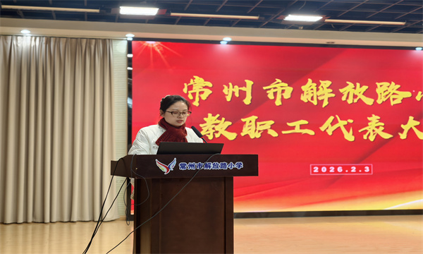 岁序更替,华章日新;凝心聚力,共赴新程。2026年2月3日下午,常州市解放路小学教职工代表大会在二楼演播厅隆重召开。学校全体教师代表齐聚一堂,本次大会由戴彩娥副校长主持,大会在庄严的国歌声中拉开帷幕。